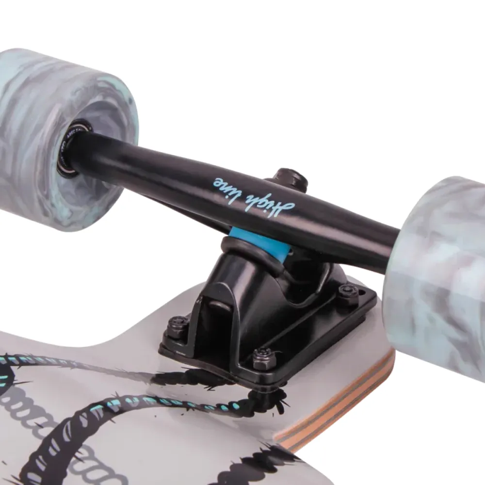Лонгборд массой 3,7 кг рассчитан на грузоподъемность до 80 кг, что допускает пользование подростками и взрослыми ездоками. Представлен стильным современным дизайном. Материал изготовления модели – дерево+полиуретан+алюминий. Из дерева изготовлена вместительная дека, поверхностная часть которой покрыта нескользящей наждачкой. Колесная часть – полиуретановая, мало стираемая и долговечная. Из алюминия изготовлена подвеска.