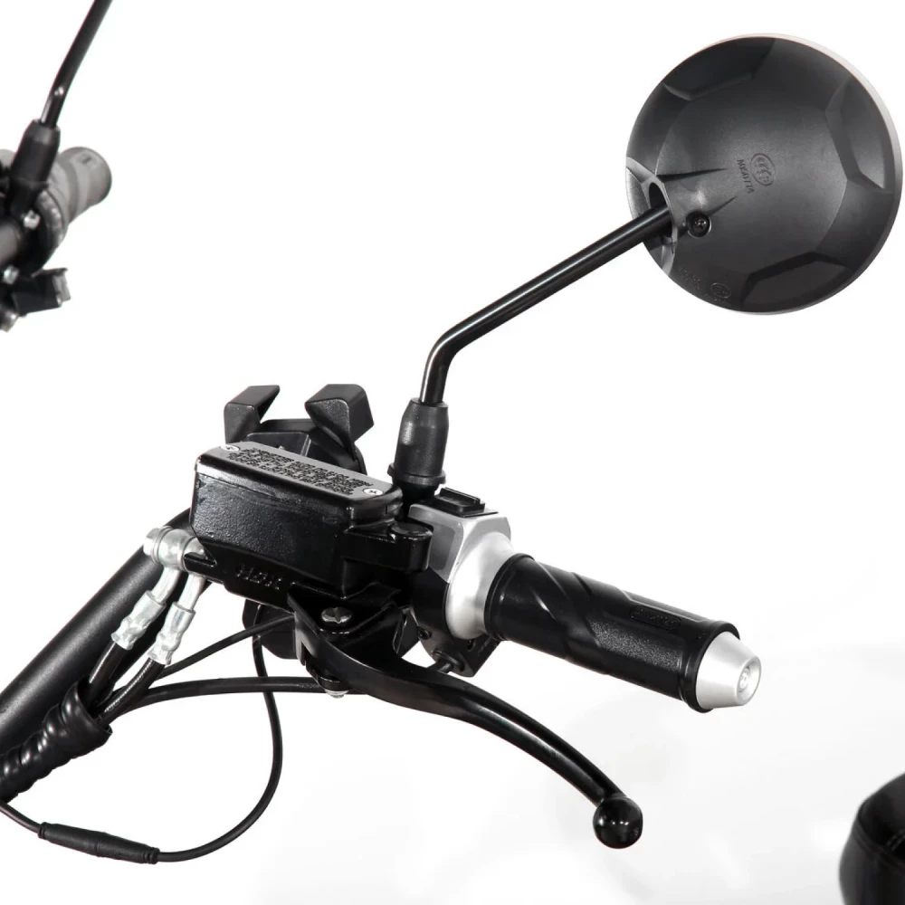Данный электросутер оснащен широкими колесами и качественной системой амортизации.