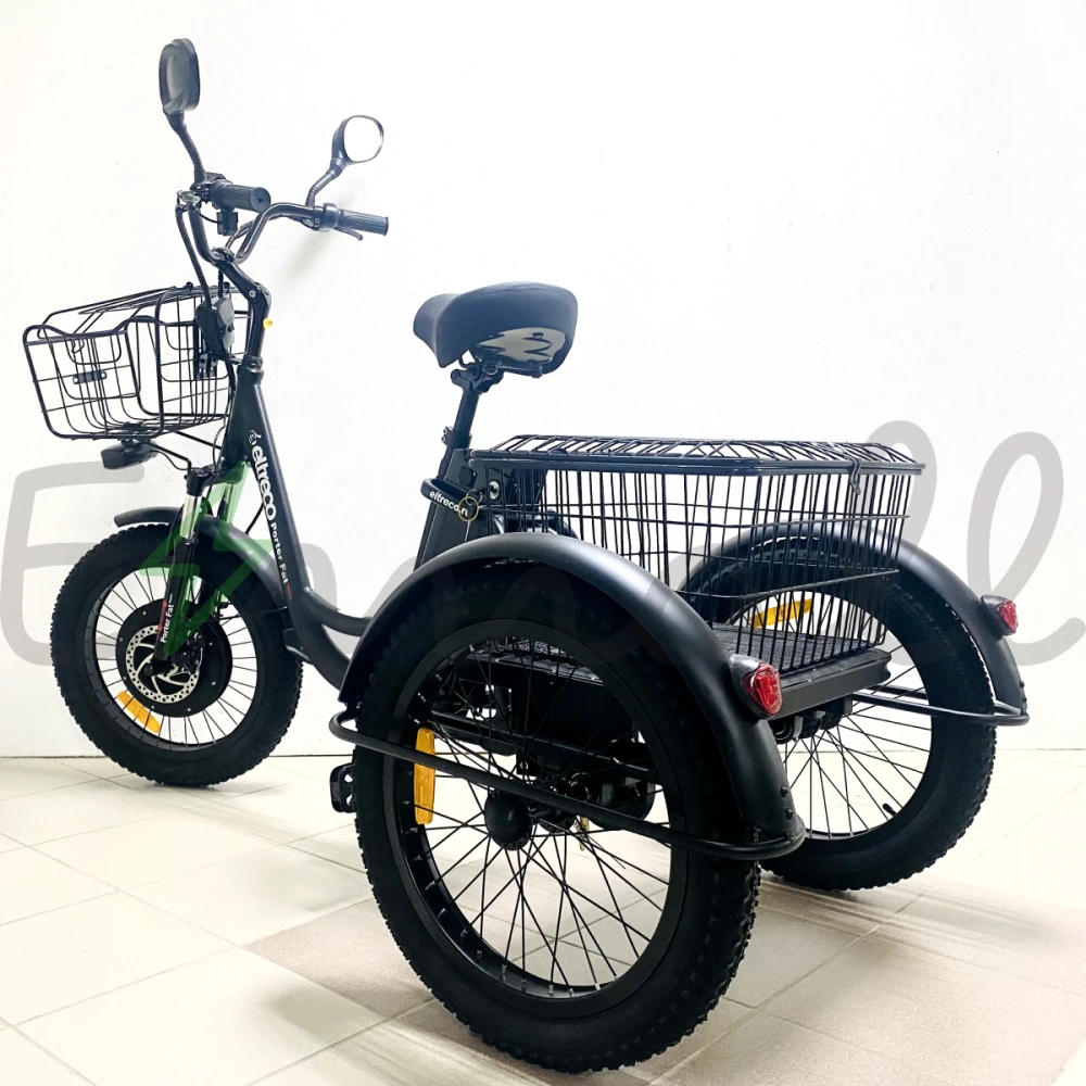 ТРИЦИКЛ ELTRECO PORTER FAT 500 имеет устойчивые колеса диаметром 20 дюймов, достигает скорости в 35 км/час, выдерживает нагрузку в 110 кг.