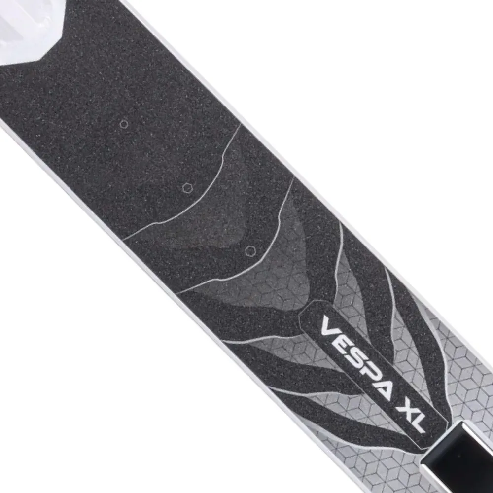 Алюминиевая дека легкая и нескользящая, размерами по длине и ширине 48 см и 10 см обещает размещение двух стоп одновременно. Наличие заглушек на тыльных частях деки исключает ее преждевременную порчу. Рулевая часть в виде чайки не провоцирует усталости рук. Оснащена двухцветными нескользящими грипсами, увеличивающими степень безопасности ездока. IHC-компрессия исключает появление люфта, посторонних шумов и других проблем.