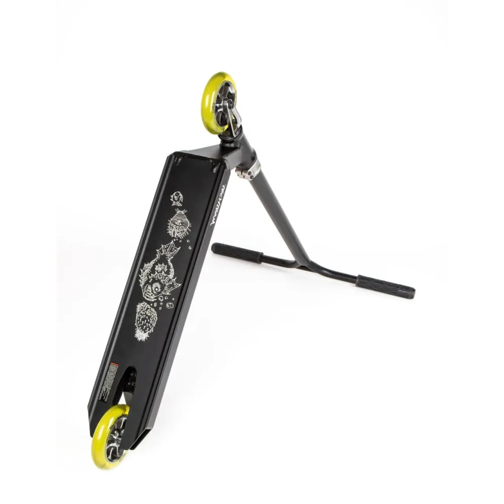 Алюминиевая колесная часть открашена специальной краской, подчеркивающей эксклюзивность дизайна самоката. Мало стираемые колеса, стальная тормозная система в сочетании с профессионализмом райдера обещает отличное время провождение.