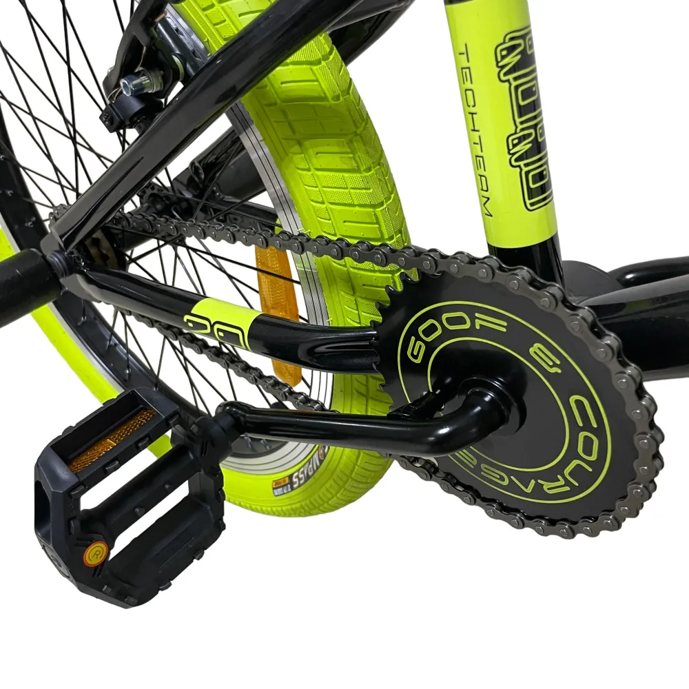 Велосипед BMX Tech Team GOOF 2024 в черном цвете с зеленоватыми рулем и покрышками – это сочетание стиля и надежности. С максимальной нагрузкой до 110 кг и 20-дюймовыми колесами, этот велосипед легко справится с любыми испытаниями. Ободные тормоза V-типа из алюминия спереди и сзади обеспечат безопасность и контроль. Стальная вилка и рама размером 18,7 дюйма делают этот велосипед прочным и готовым к любым трюкам. Пеги на передних и задних колесах и трещотка на 16 зубьев добавляют функциональности и делают его идеальным для экстремальных видов спорта.